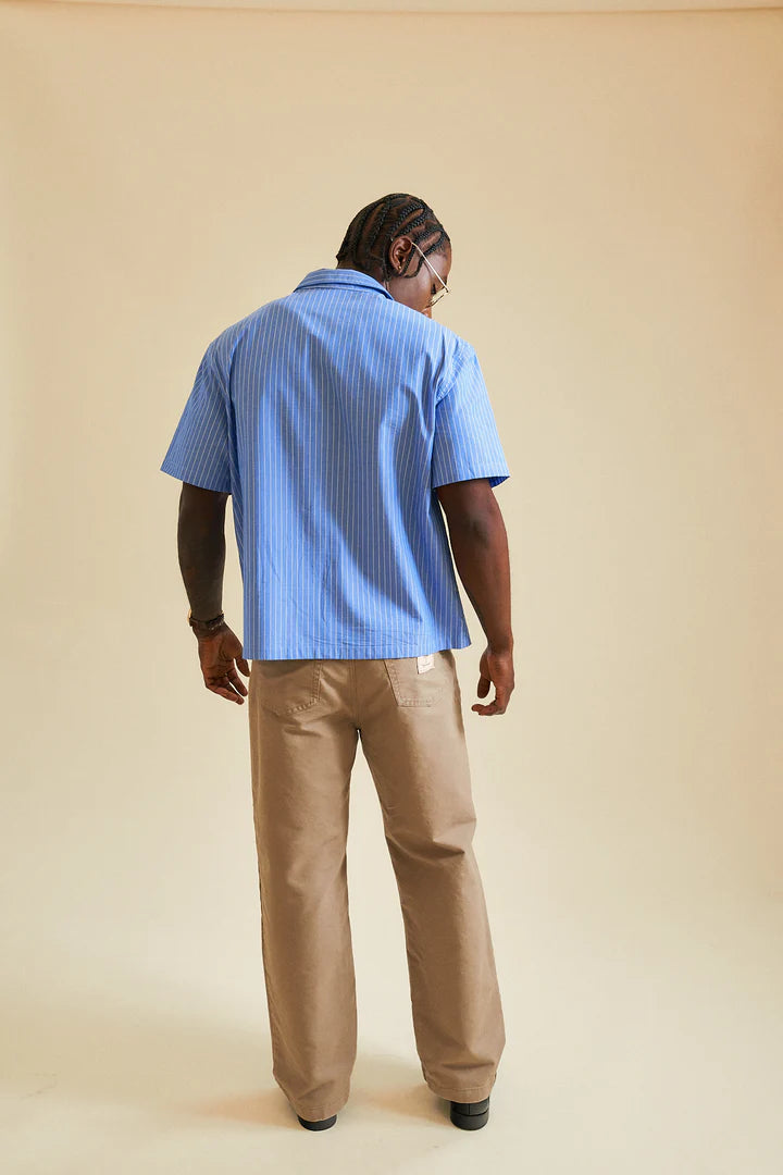 Camisa de botones con un fit regular en color azul con lineas blancas, detalle en el bolsillo con una etiqueta del logo de la marca, hecha en tela 100% algodón de 110 gr.