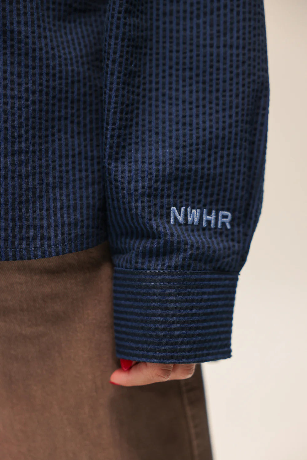 Camisa de corte oversize con ojales blancos y etiqueta oculta debajo del último botón. La camisa está fabricado en un tejido seersucker en dos colores. El origen del tejido es portugués y la confección la hacemos en Galicia, España.