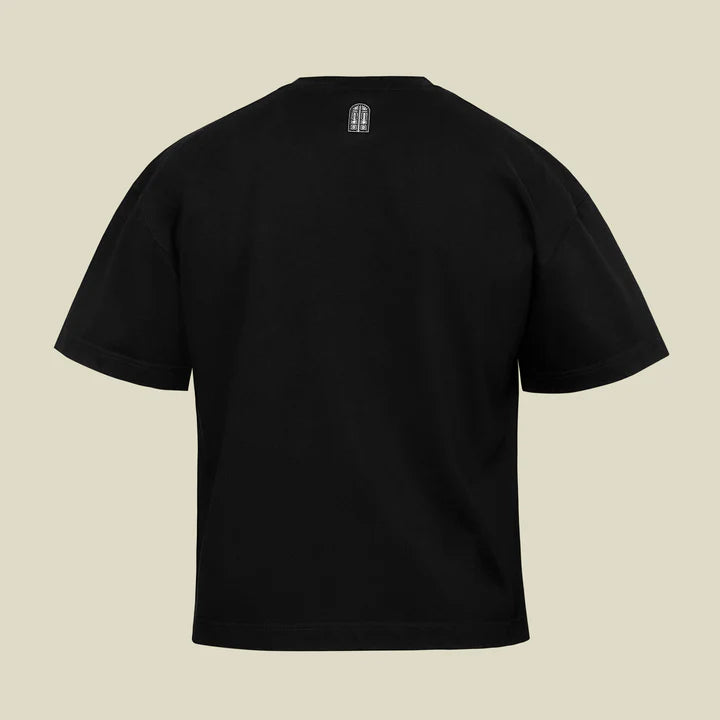 Camiseta boxy fit color negro con una ilustración en estampado digital en el pecho y en la parte trasera tiene una pequeña estampación, hecha en tela 100% algodón de 300 gr y cuello redondo en Rib