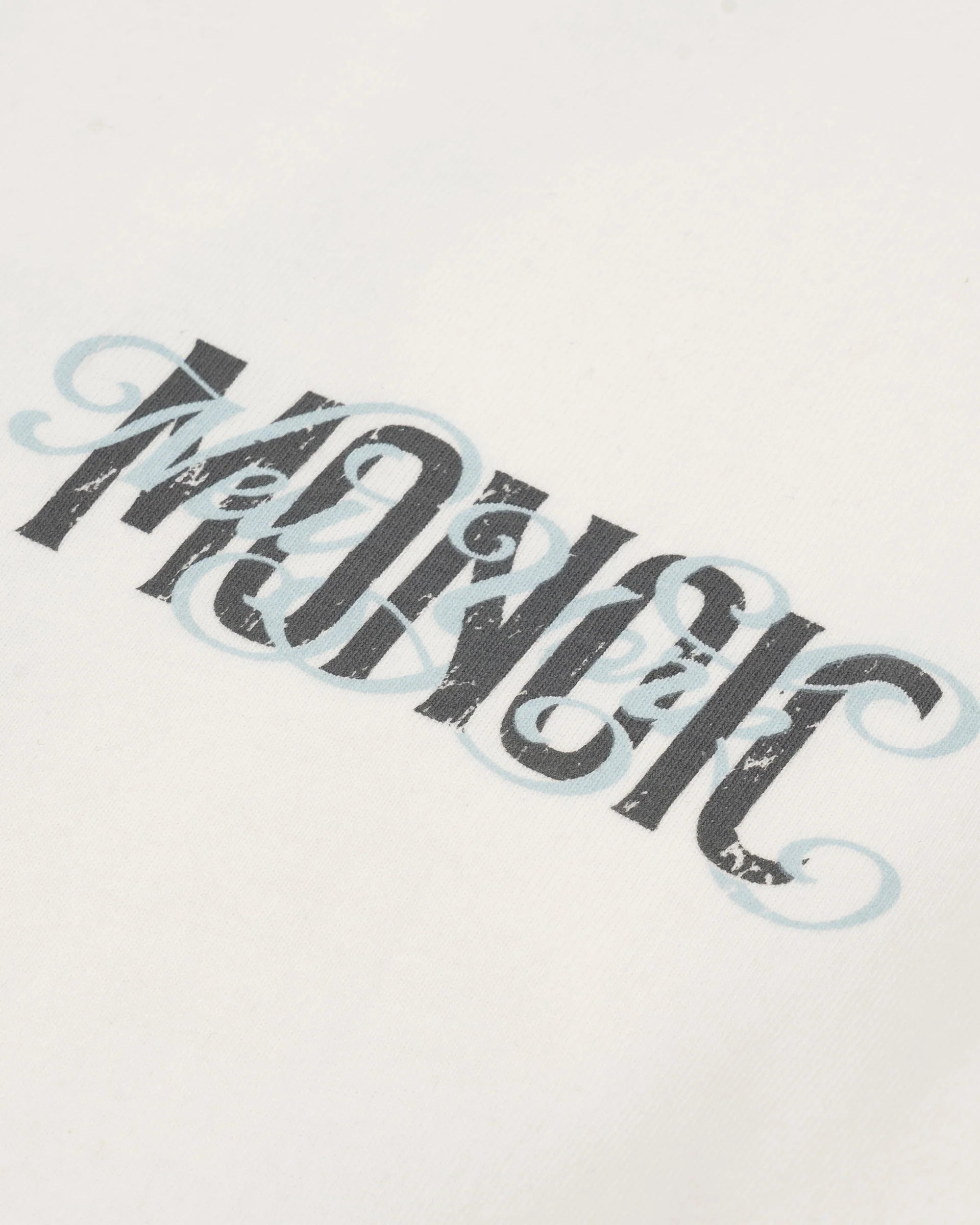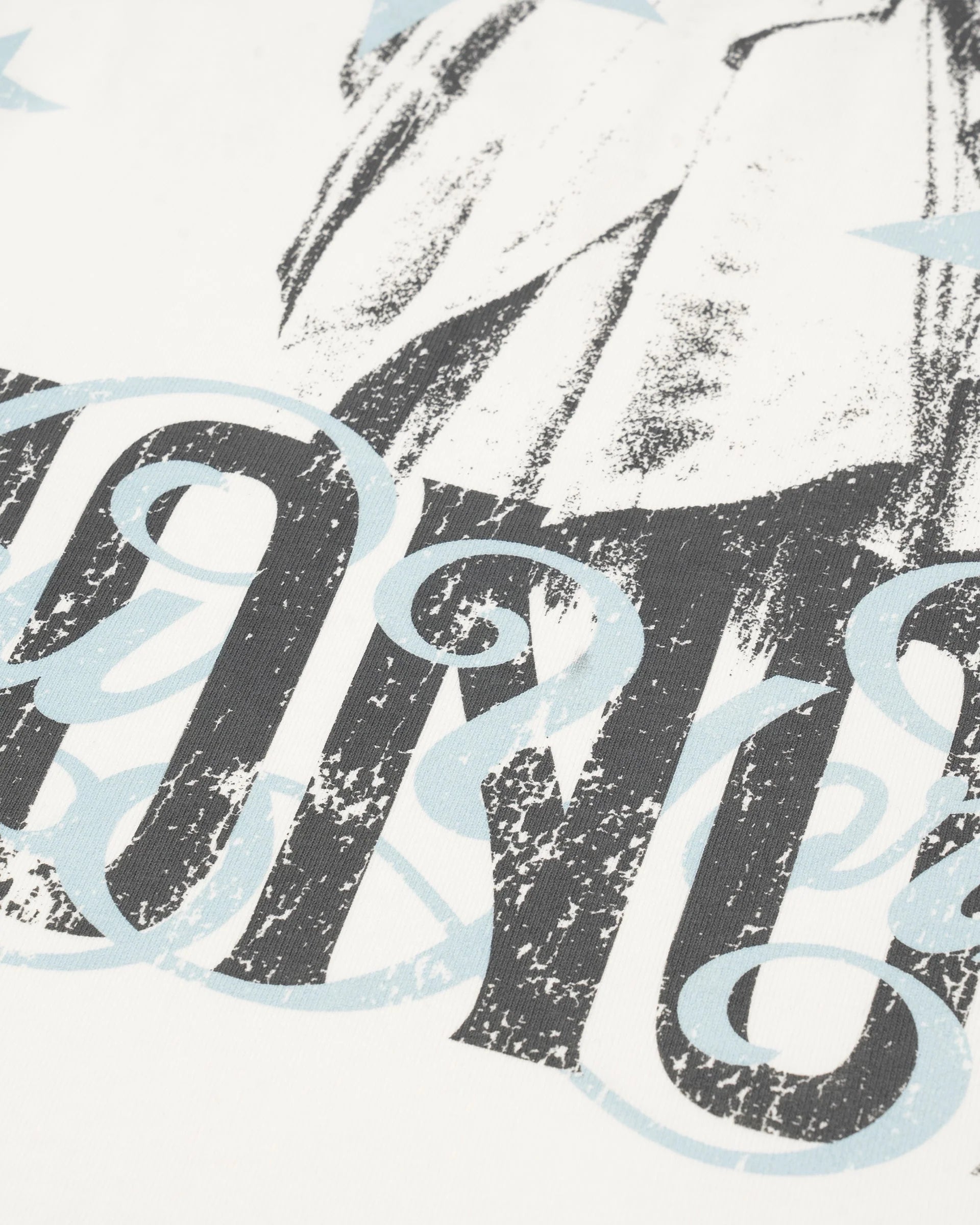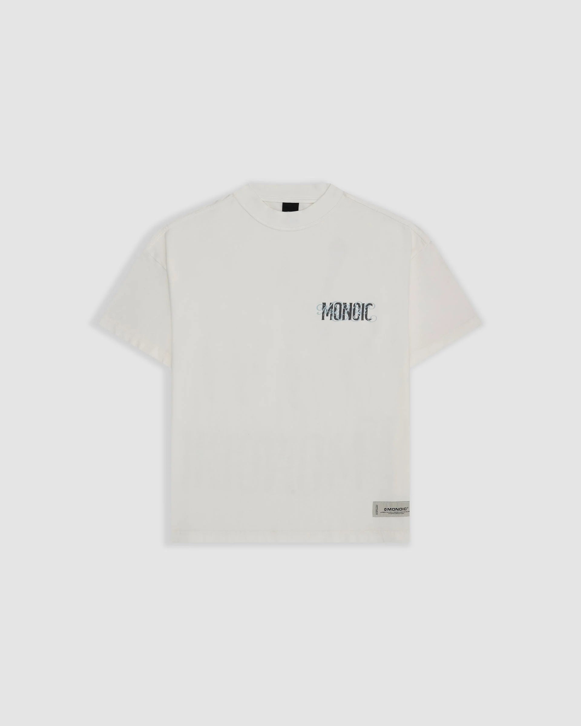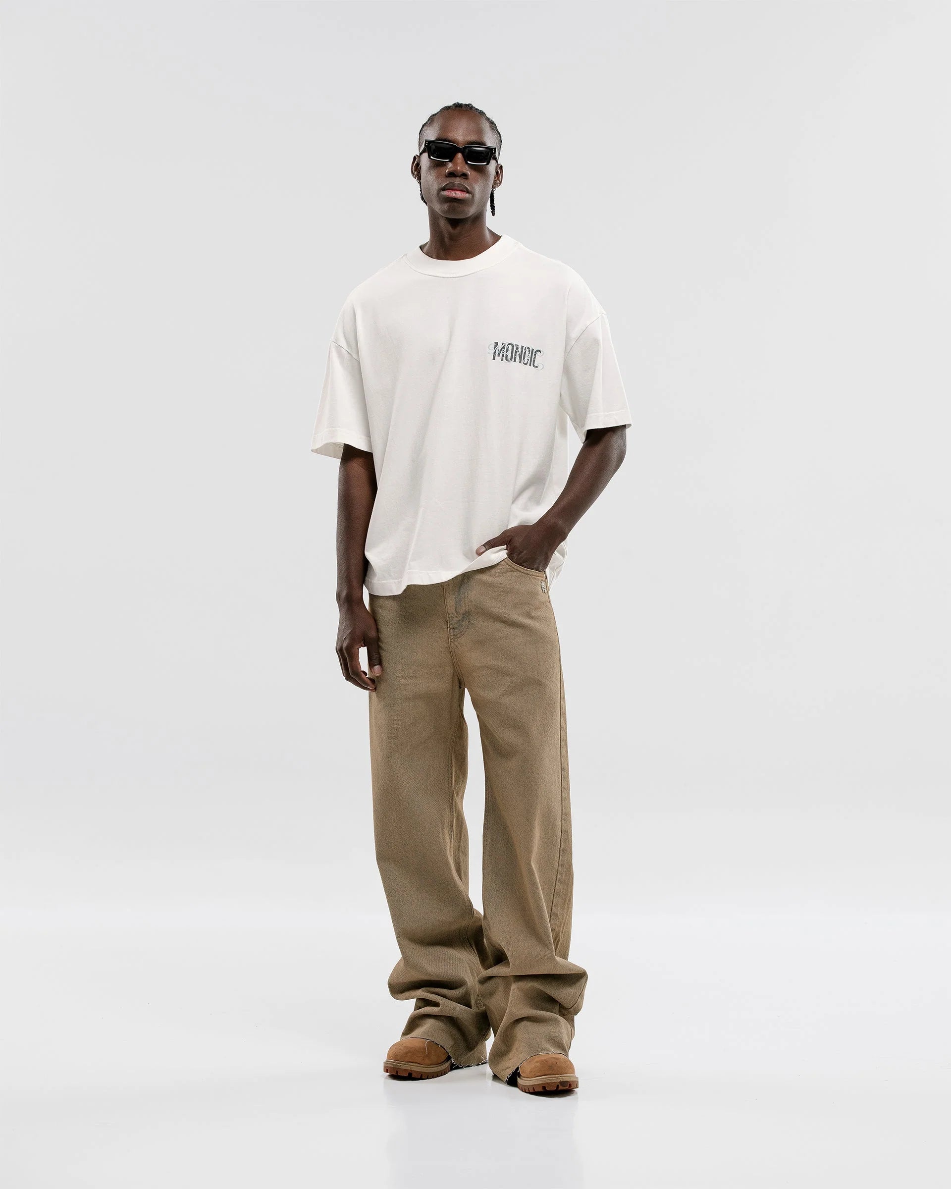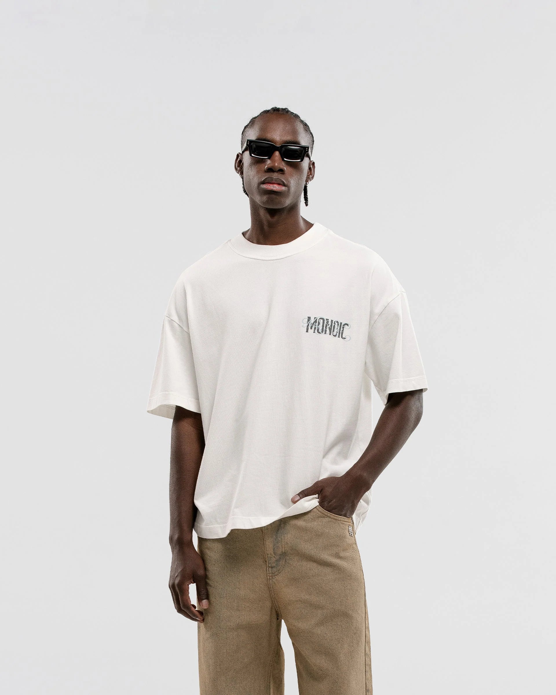 Short-sleeve t-shirt in Bone White with a boxy fit, made from premium high-weight cotton jersey. The t-shirt features a ribbed round neckline and a no-touch screen print on the back.