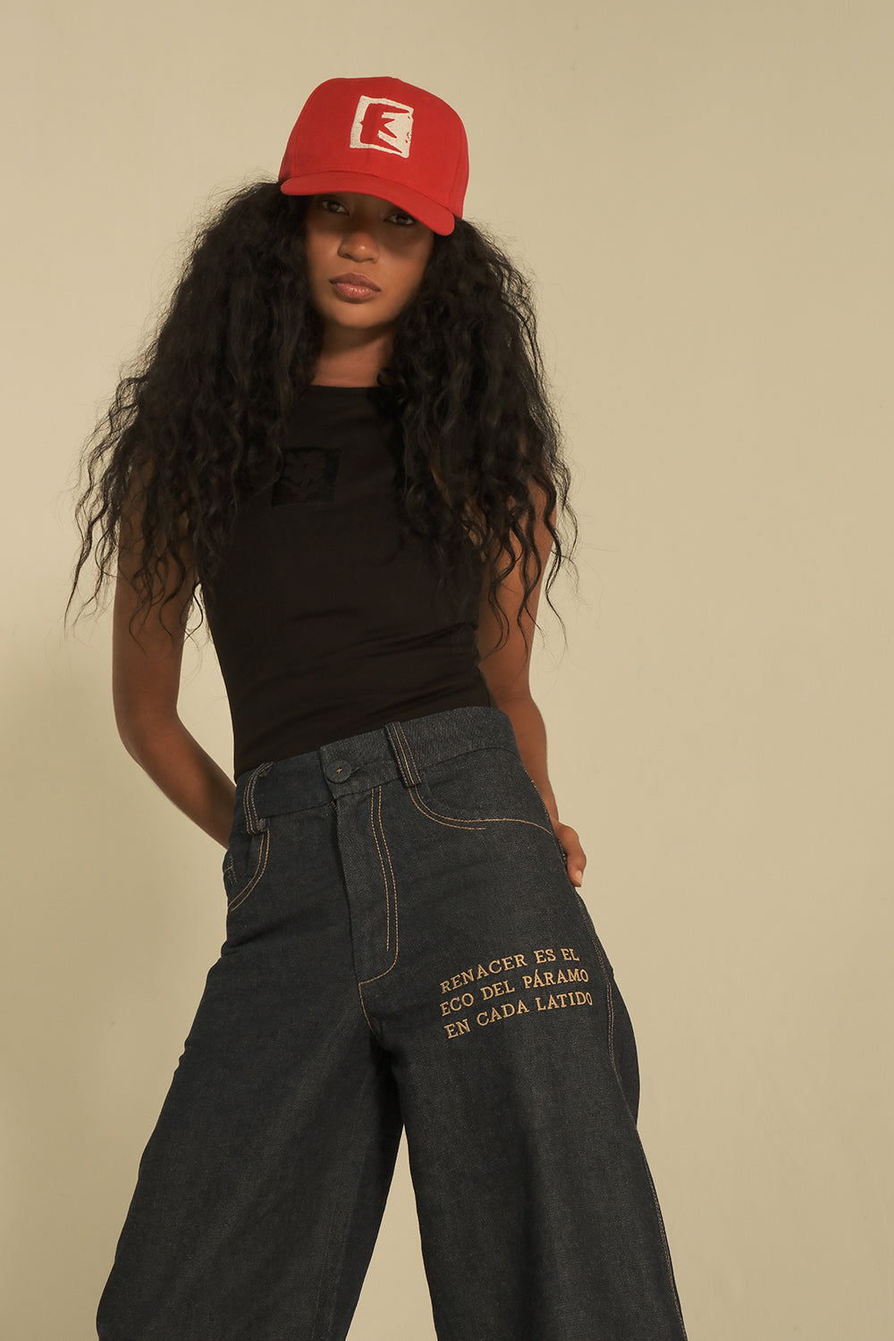 Nuestro Jean Retoño está confeccionado en denim rígido 100% algodón, con un tono índigo oscuro que resalta su carácter atemporal. Su silueta de pierna amplia y tiro alto te dan estructura sin sacrificar comodidad. También destaca por sus bordados en hilo dorado: al frente, la frase “Renacer es el eco del páramo en cada latido”; y en el bolsillo trasero, “Florece renace”, mensajes que conectan con la fuerza del paisaje andino. En el lateral de una pierna, parches bordados con símbolos de la fauna y flora del páramo suman un detalle artesanal y lleno de sentido. Con costuras reforzadas, dobladillo ancho y un fit relajado, este jean te acompaña con estilo y propósito
