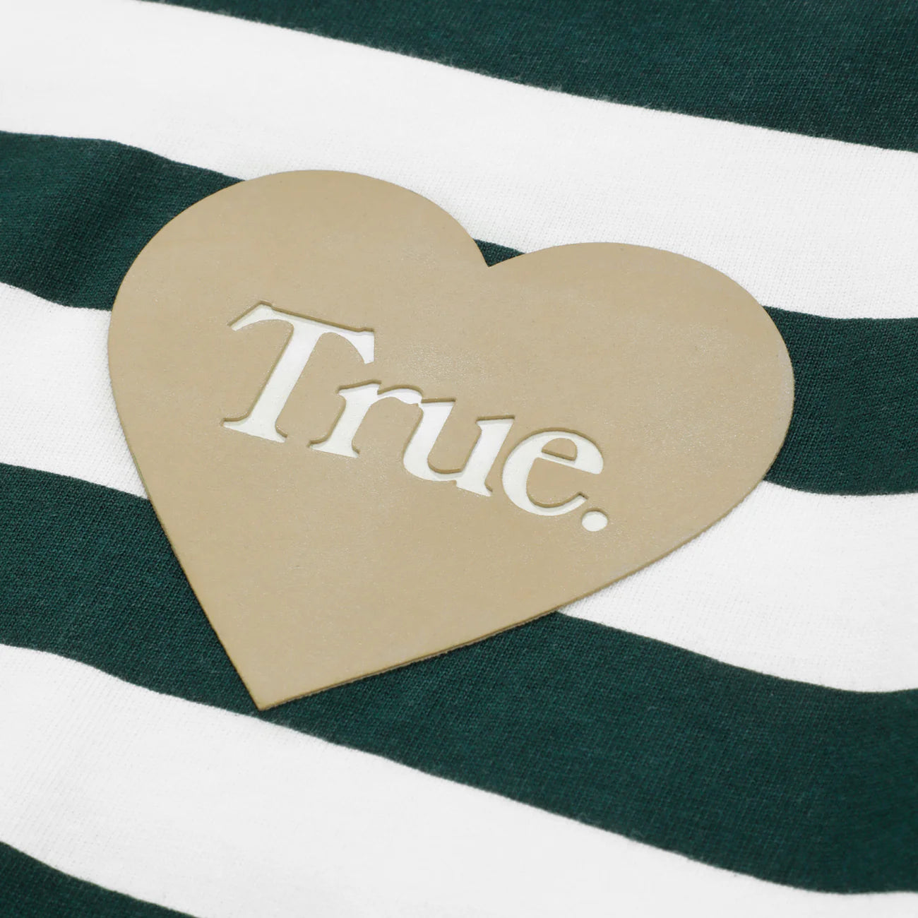 Green and white striped design made from 100% cotton. Features a high-density camel-colored print on the front. Ribbed neckline.
